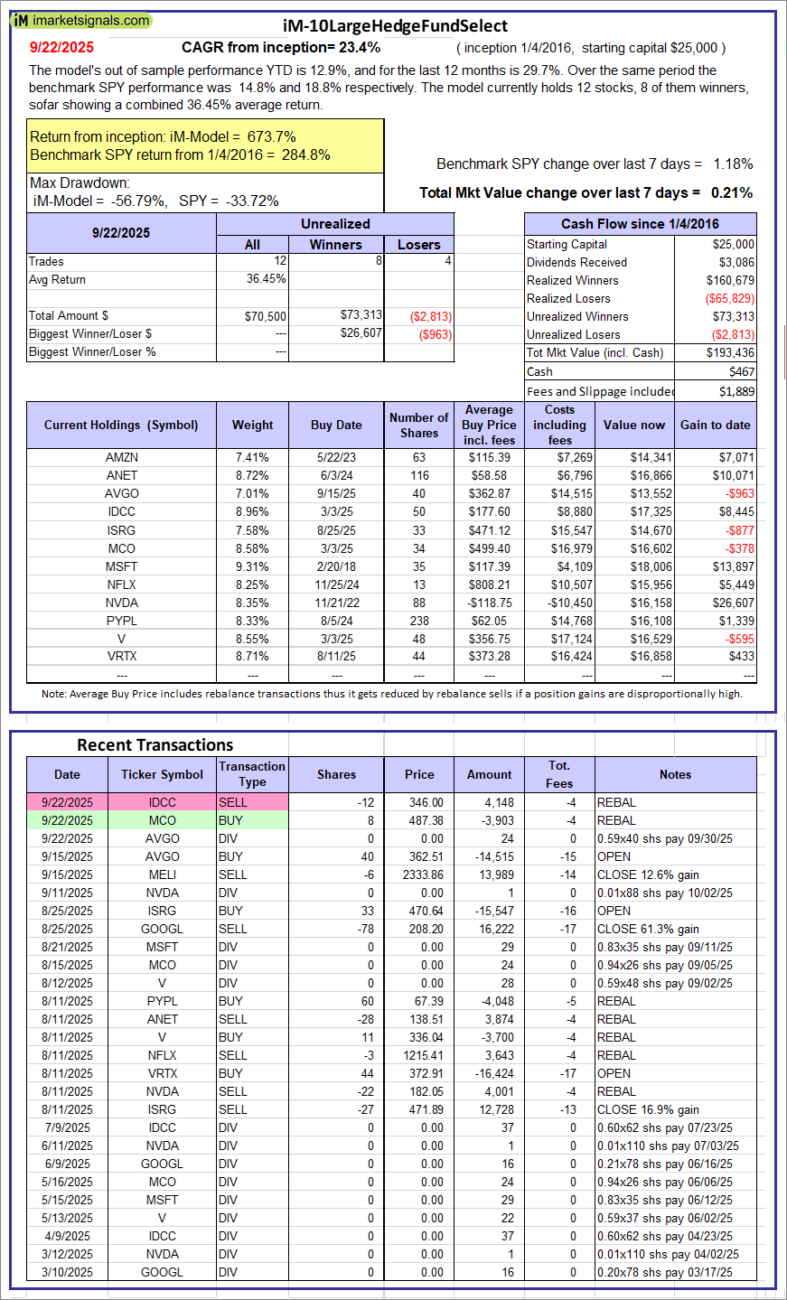 iM-10LargeHedgeFundSelect: Since inception, on 1/5/2016, the model gained 673.74% while the benchmark SPY gained 284.79% over the same period. Over the previous week the market value of iM-10LargeHedgeFundSelect gained 0.21% at a time when SPY gained 1.18%. A starting capital of $25,000 at inception on 1/5/2016 would have grown to $193,436 which includes $467 cash and excludes $1,889 spent on fees and slippage.