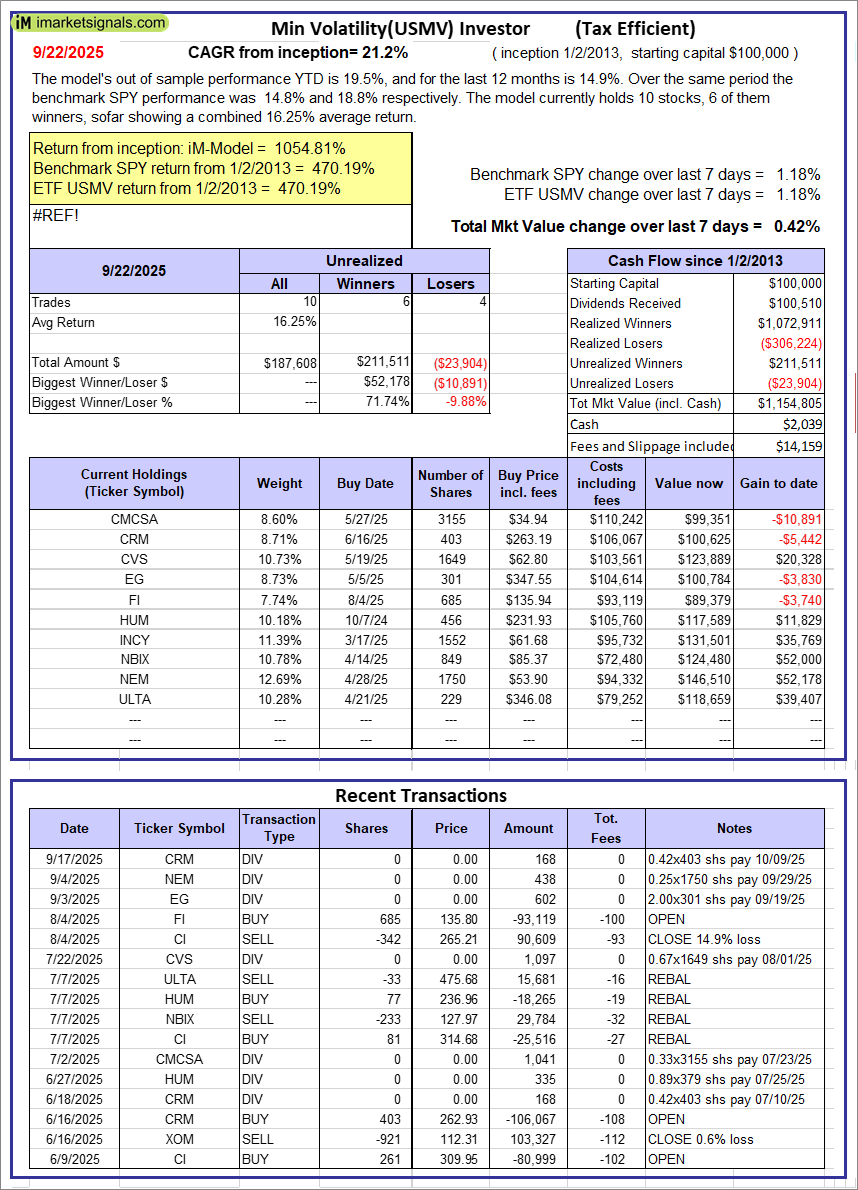 iM-Best12(USMV)-Trader: The model’s out of sample performance YTD is 21.9%, and for the last 12 months is 23.7%. Over the same period the benchmark SPY performance was 14.8% and 18.8% respectively. Since inception, on 6/30/2014, the model gained 316.88% while the benchmark SPY gained 313.06% and the ETF USMV gained 210.97% over the same period. Over the previous week the market value of iM-Best12(USMV)-Trader gained 1.01% at a time when SPY gained 1.18%. A starting capital of $100,000 at inception on 6/30/2014 would have grown to $416,884 which includes $2,440 cash and excludes $8,600 spent on fees and slippage.