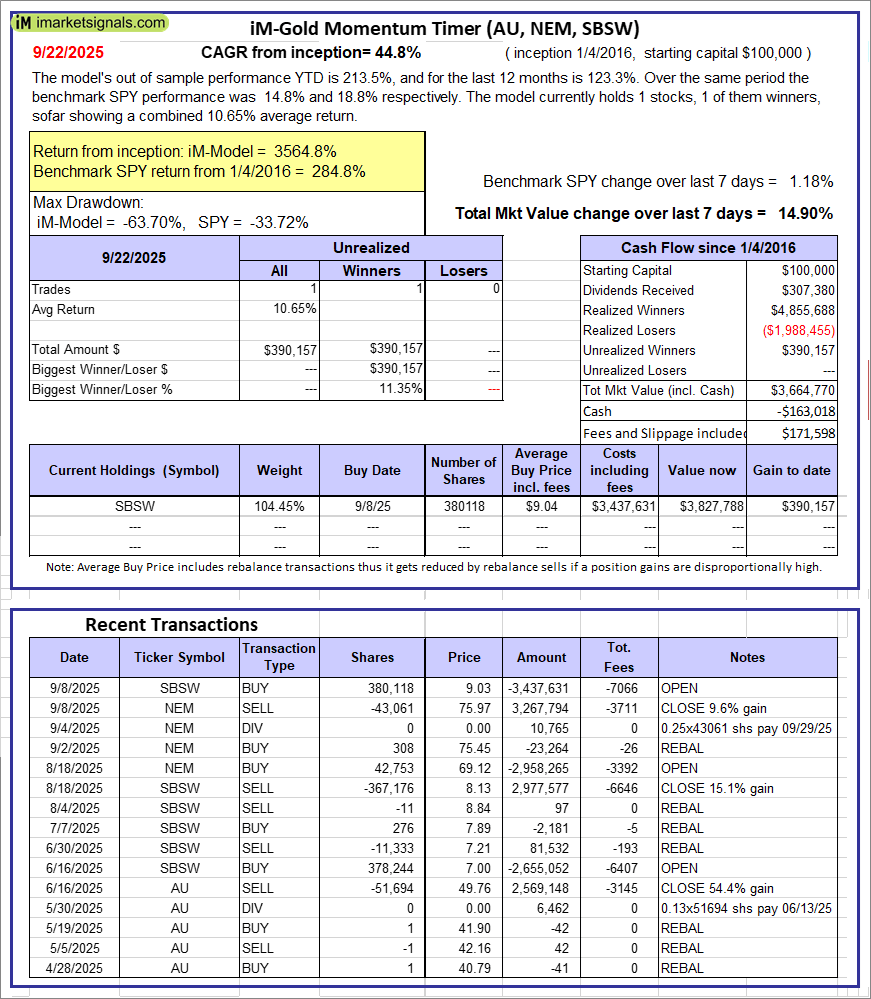 iM-Gold Momentum Timer (AU, NEM, SBSW): The model’s out of sample performance YTD is 213.5%, and for the last 12 months is 123.3%. Over the same period the benchmark SPY performance was 14.8% and 18.8% respectively. Over the previous week the market value of iM-Gold Momentum Timer (AU, NEM, SBSW) gained 14.90% at a time when SPY gained 1.18%. A starting capital of $100,000 at inception on 6/30/2016 would have grown to -$163,018 which includes $171,598 cash and excludes Gain to date spent on fees and slippage.