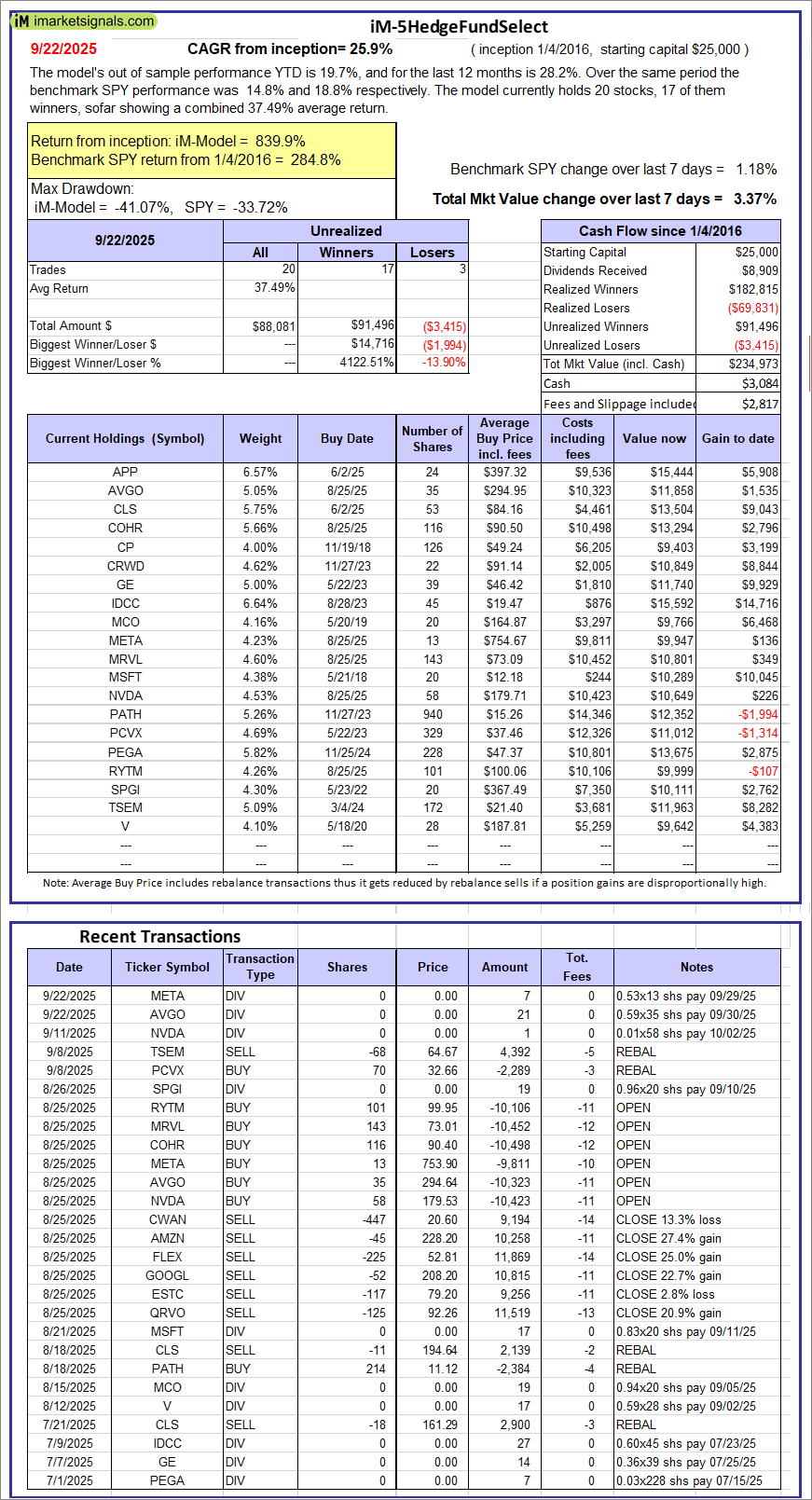 iM-5HedgeFundSelect: Since inception, on 1/5/2016, the model gained 839.89% while the benchmark SPY gained 284.79% over the same period. Over the previous week the market value of iM-5HedgeFundSelect gained 3.37% at a time when SPY gained 1.18%. A starting capital of $25,000 at inception on 1/5/2016 would have grown to $234,973 which includes $3,084 cash and excludes $2,817 spent on fees and slippage.