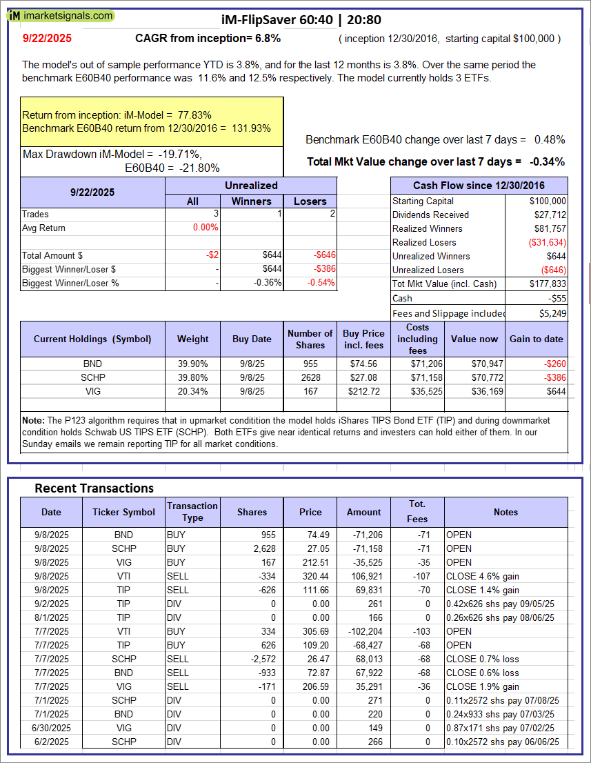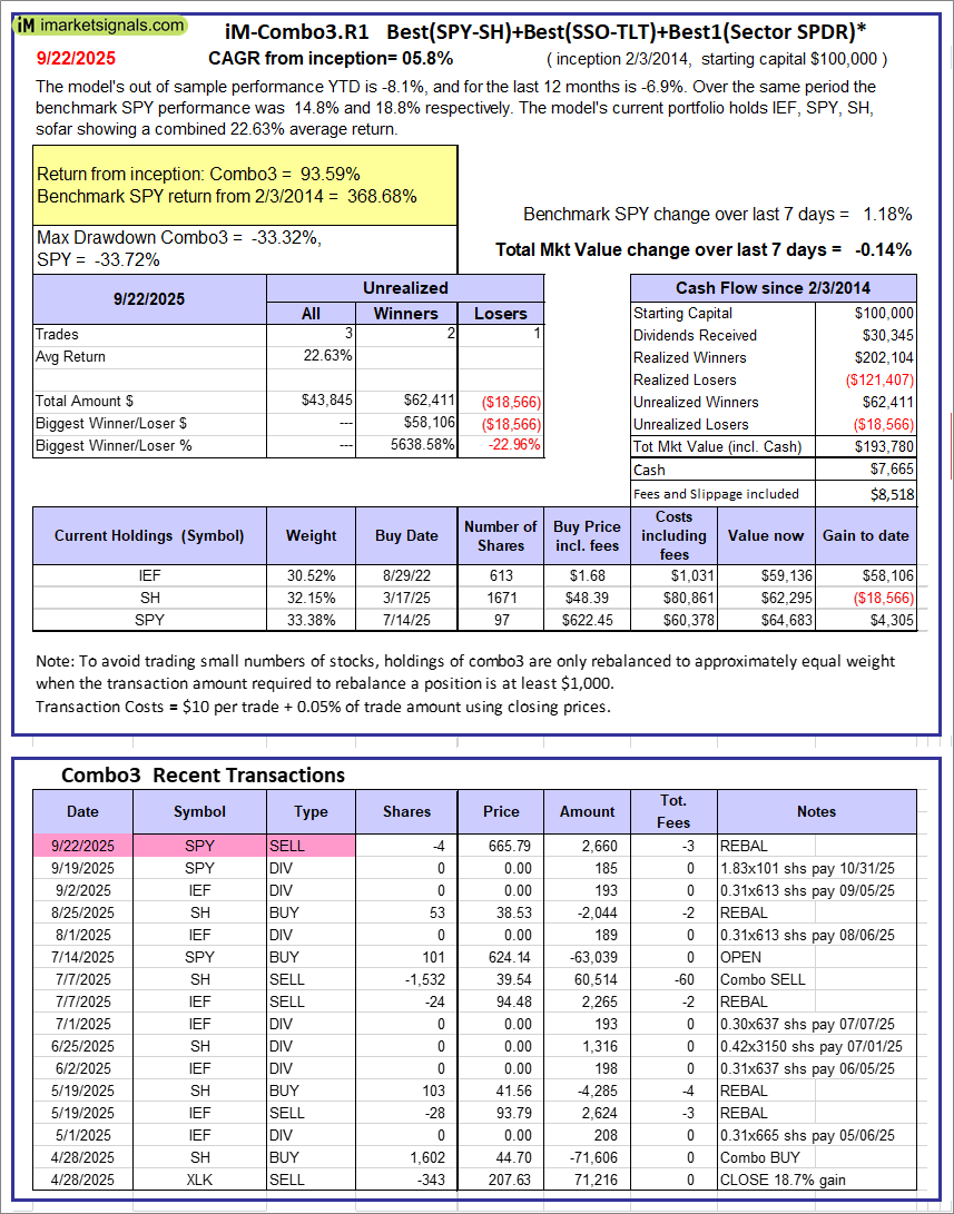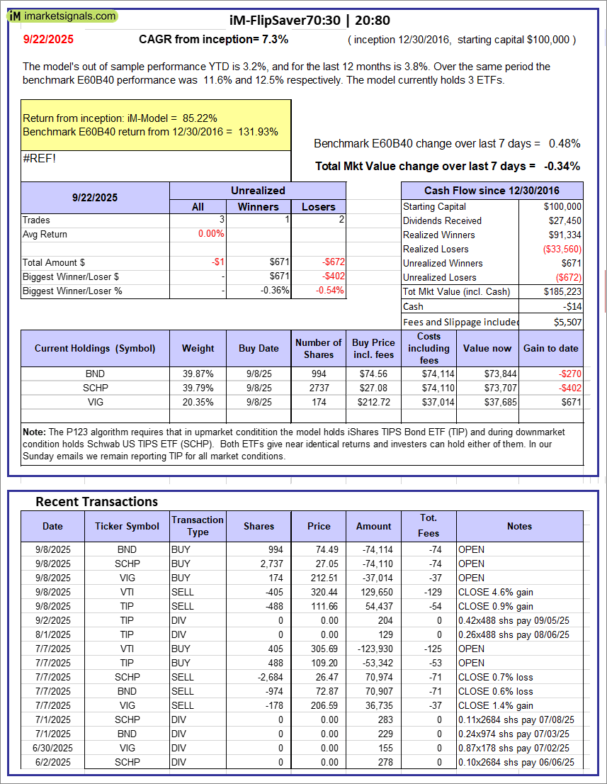 iM-Composite (SPY-IEF) Timer: The model’s out of sample performance YTD is -0.3%, and for the last 12 months is 0.8%. Over the same period the benchmark SPY performance was 14.8% and 18.8% respectively. Over the previous week the market value of the iM-Composite (SPY-IEF) Timer gained -0.69% at a time when SPY gained 1.18%. A starting capital of $100,000 at inception on 6/30/2016 would have grown to $214,571 which includes -$75 cash and excludes $8,216 spent on fees and slippage.