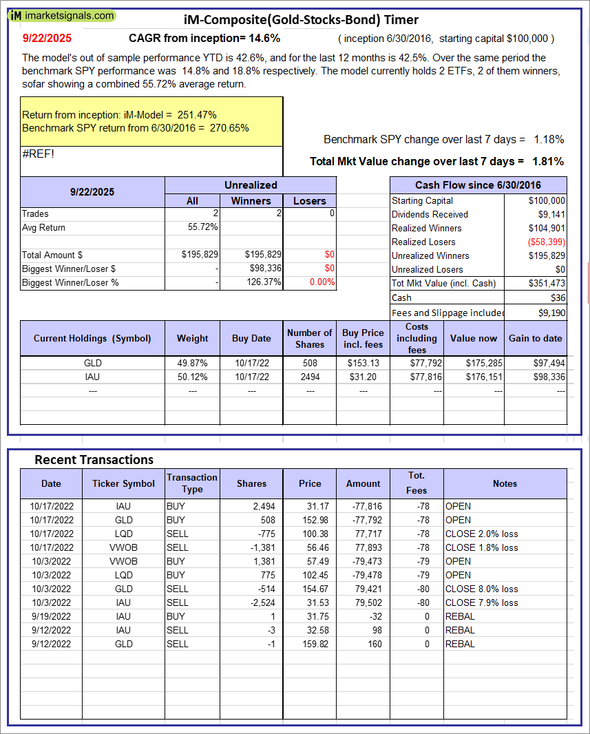 iM-Composite(Gold-Stocks-Bond) Timer: The model’s out of sample performance YTD is 42.6%, and for the last 12 months is 42.5%. Over the same period the benchmark SPY performance was 14.8% and 18.8% respectively. Over the previous week the market value of the iM-Composite(Gold-Stocks-Bond) Timer gained 1.81% at a time when SPY gained 1.18%. A starting capital of $100,000 at inception on 6/30/2016 would have grown to $351,473 which includes $36 cash and excludes $9,190 spent on fees and slippage.