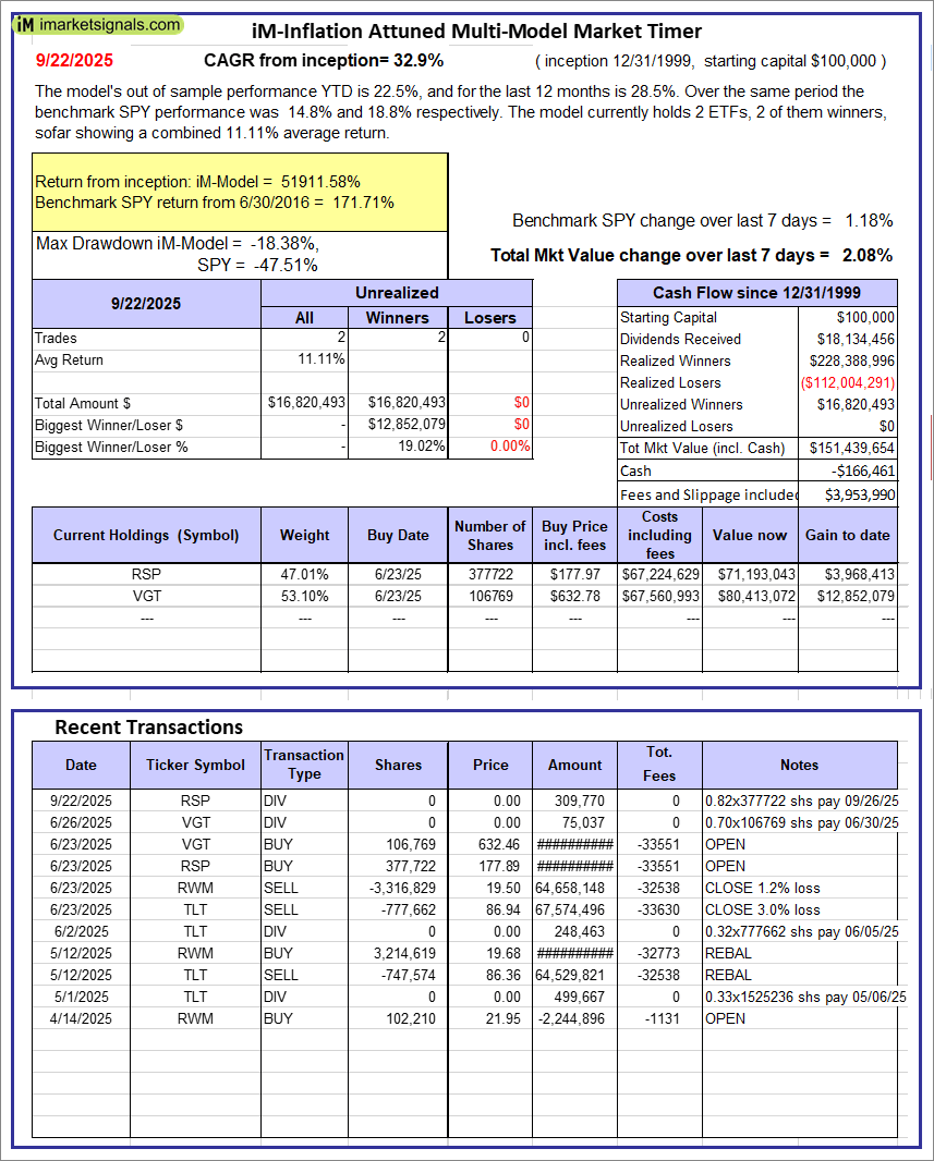 iM-Inflation Attuned Multi-Model Market Timer: The model’s out of sample performance YTD is 22.5%, and for the last 12 months is 28.5%. Over the same period the benchmark SPY performance was 14.8% and 18.8% respectively. Over the previous week the market value of the iM-Inflation Attuned Multi-Model Market Timer gained 2.08% at a time when SPY gained 1.18%. A starting capital of $100,000 at inception on 3/24/2017 would have grown to $151,439,654 which includes -$166,461 cash and excludes $3,953,990 spent on fees and slippage.