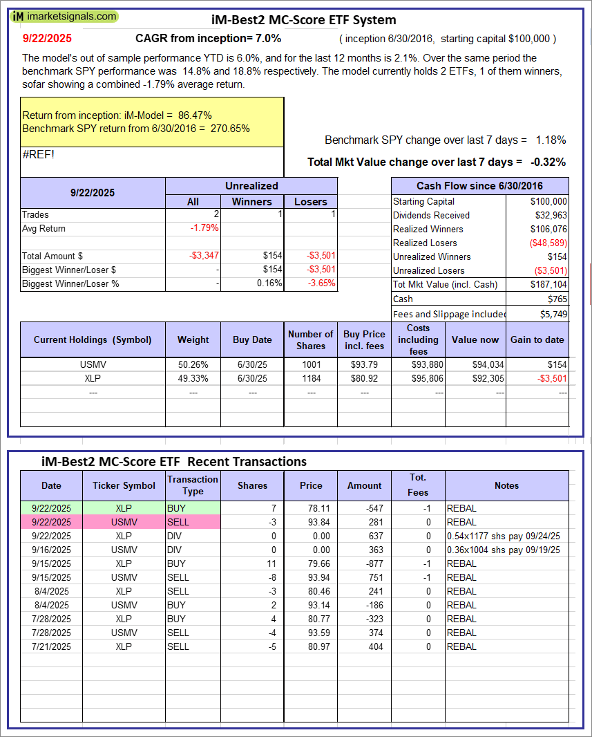 iM-Best2 MC-Score ETF System: The model’s out of sample performance YTD is 6.0%, and for the last 12 months is 2.1%. Over the same period the benchmark SPY performance was 14.8% and 18.8% respectively. Over the previous week the market value of the iM-Best2 MC-Score ETF System gained -0.32% at a time when SPY gained 1.18%. A starting capital of $100,000 at inception on 6/30/2016 would have grown to $187,104 which includes $765 cash and excludes $5,749 spent on fees and slippage.