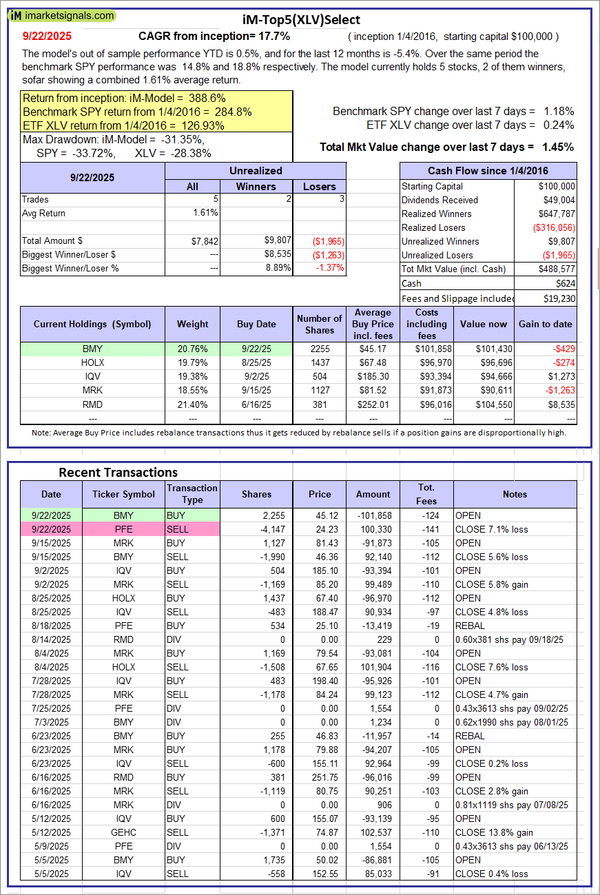 iM-Top5(XLV)Select: Since inception, on 1/5/2016, the model gained 388.58% while the benchmark SPY gained 284.79% over the same period. Over the previous week the market value of iM-Top5(XLV)Select gained 1.45% at a time when SPY gained 1.18%. A starting capital of $100,000 at inception on 1/5/2016 would have grown to $488,577 which includes $624 cash and excludes $19,230 spent on fees and slippage.