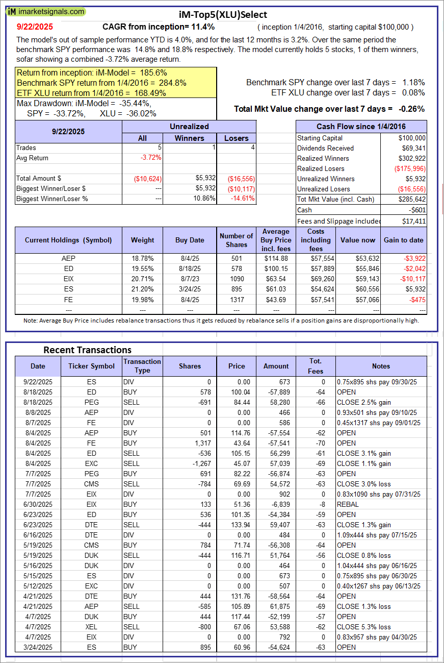 iM-Top5(XLU)Select: Since inception, on 1/5/2016, the model gained 185.64% while the benchmark SPY gained 284.79% over the same period. Over the previous week the market value of iM-Top5(XLU)Select gained -0.26% at a time when SPY gained 1.18%. A starting capital of $100,000 at inception on 1/5/2016 would have grown to $285,642 which includes -$601 cash and excludes $17,411 spent on fees and slippage.