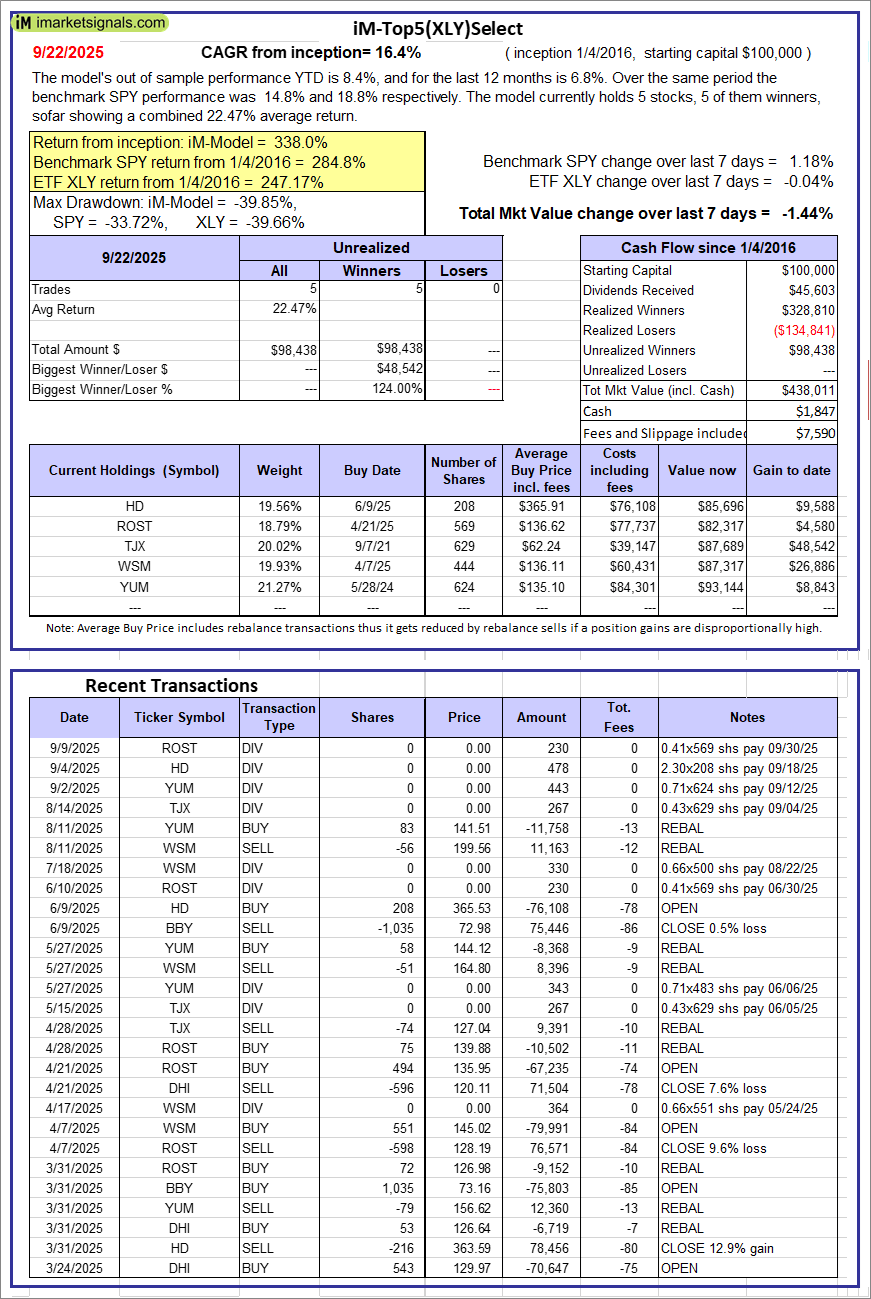 iM-Top5(XLY)Select: Since inception, on 1/5/2016, the model gained 338.01% while the benchmark SPY gained 284.79% over the same period. Over the previous week the market value of iM-Top5(XLY)Select gained -1.44% at a time when SPY gained 1.18%. A starting capital of $100,000 at inception on 1/5/2016 would have grown to $438,011 which includes $1,847 cash and excludes $7,590 spent on fees and slippage.