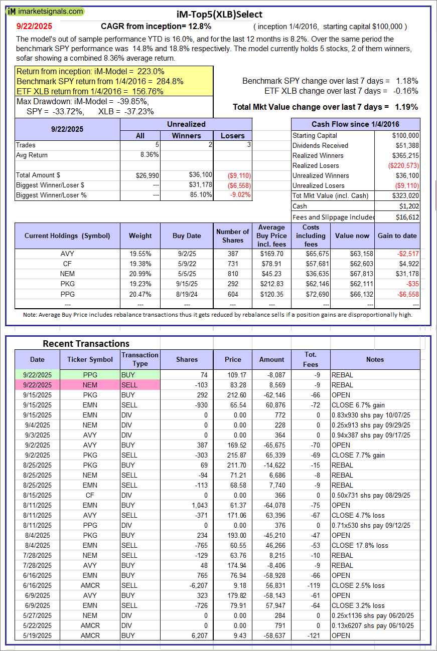 iM-Top5(XLB)Select: Since inception, on 1/5/2016, the model gained 223.02% while the benchmark SPY gained 284.79% over the same period. Over the previous week the market value of iM-Top5(XLB)Select gained 1.19% at a time when SPY gained 1.18%. A starting capital of $100,000 at inception on 1/5/2016 would have grown to $323,020 which includes $1,202 cash and excludes $16,612 spent on fees and slippage.