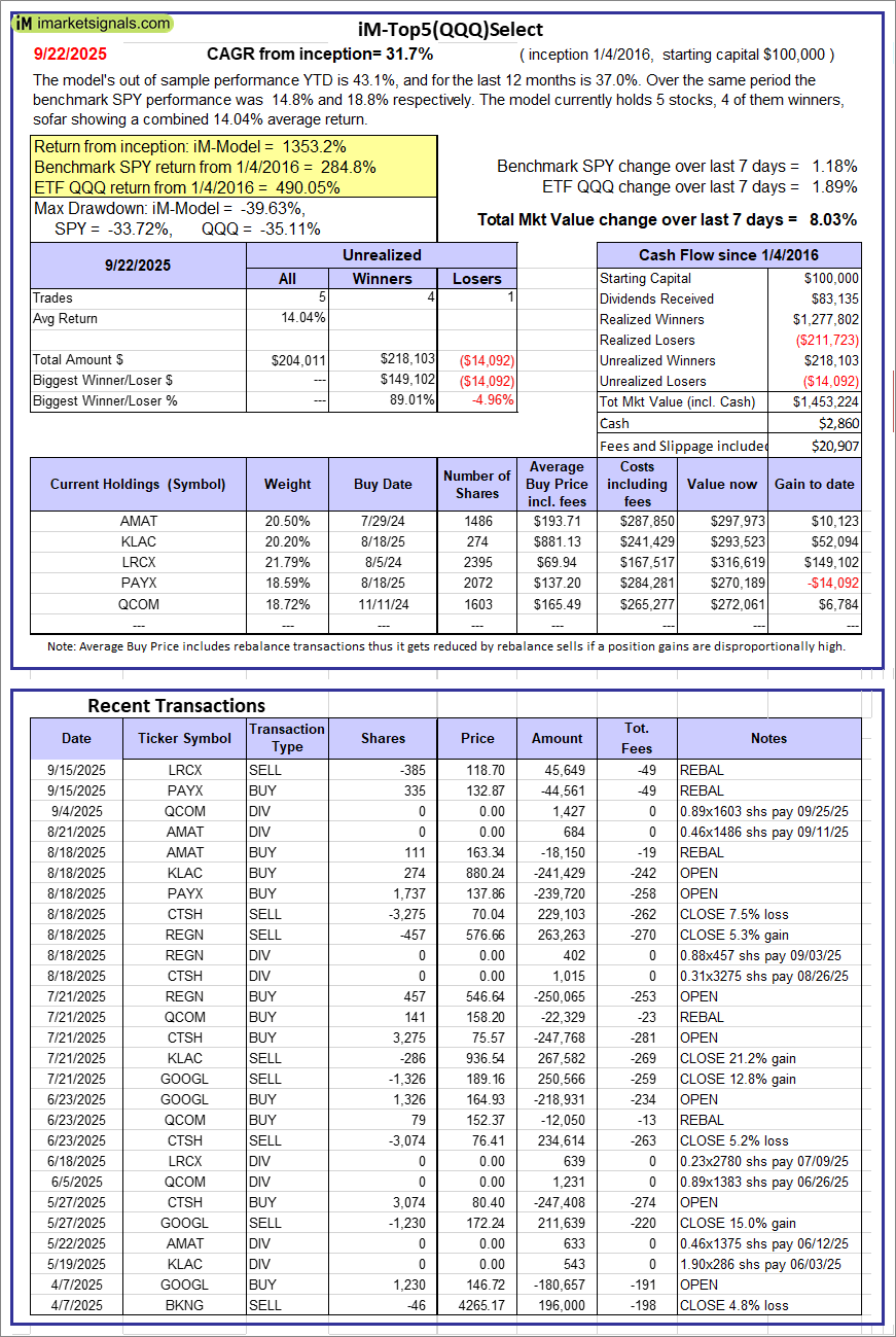 iM-Top5(QQQ)Select: Since inception, on 1/5/2016, the model gained 1353.22% while the benchmark SPY gained 284.79% over the same period. Over the previous week the market value of iM-Top5(QQQ)Select gained 8.03% at a time when SPY gained 1.18%. A starting capital of $100,000 at inception on 1/5/2016 would have grown to $1,453,224 which includes $2,860 cash and excludes $20,907 spent on fees and slippage.