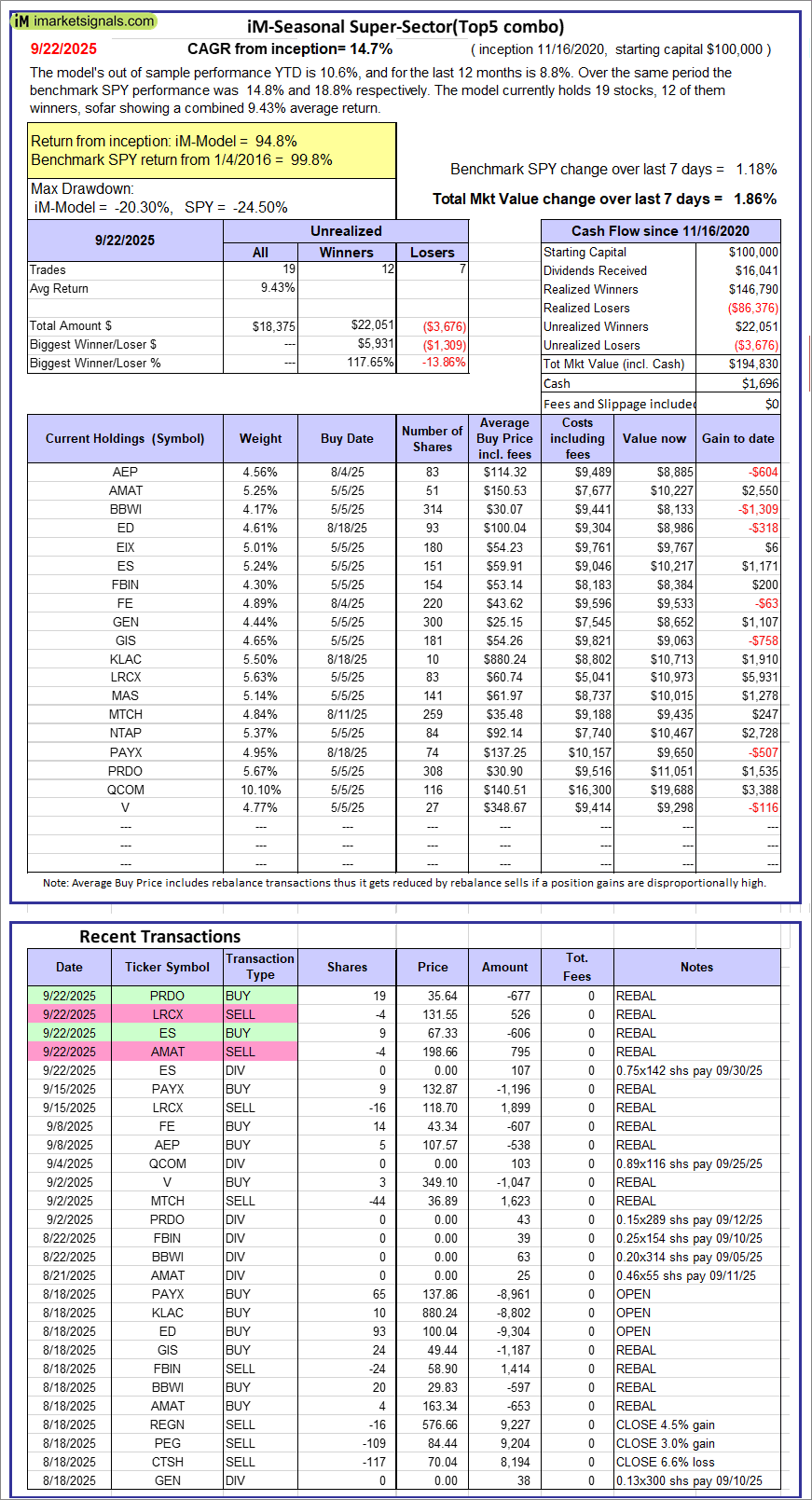 iM-Seasonal Super-Sectors (Top5 combo) : Since inception, on 11/17/2020, the model gained 94.83% while the benchmark SPY gained 99.75% over the same period. Over the previous week the market value of iM-Seasonal Super-Sectors (Top5 combo) gained 1.86% at a time when SPY gained 1.18%. A starting capital of $100,000 at inception on 11/17/2020 would have grown to $194,830 which includes $1,696 cash and excludes $00 spent on fees and slippage.