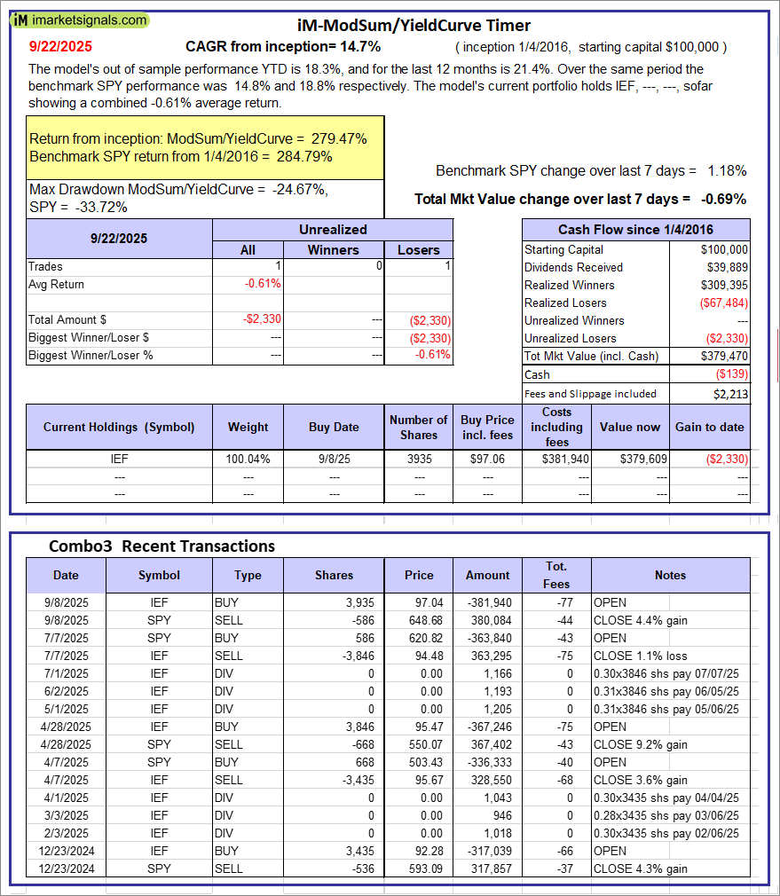 iM-ModSum/YieldCurve Timer: The model’s out of sample performance YTD is 18.3%, and for the last 12 months is 21.4%. Over the same period the benchmark SPY performance was 14.8% and 18.8% respectively. Over the previous week the market value of iM-PortSum/YieldCurve Timer gained -0.69% at a time when SPY gained 1.18%. A starting capital of $100,000 at inception on 1/1/2016 would have grown to $379,470 which includes -$139 cash and excludes $2,213 spent on fees and slippage.