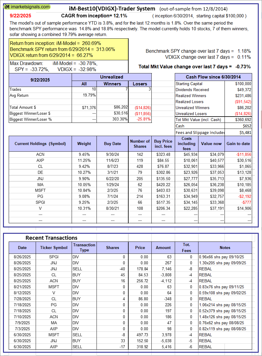 iM-Best10(VDIGX)-Trader: The model’s out of sample performance YTD is 3.8%, and for the last 12 months is 1.8%. Over the same period the benchmark SPY performance was 14.8% and 18.8% respectively. Since inception, on 7/1/2014, the model gained 260.69% while the benchmark SPY gained 313.06% and VDIGX gained 66.27% over the same period. Over the previous week the market value of iM-Best10(VDIGX) gained -0.73% at a time when SPY gained 1.18%. A starting capital of $100,000 at inception on 7/1/2014 would have grown to $360,692 which includes $652 cash and excludes $5,481 spent on fees and slippage.