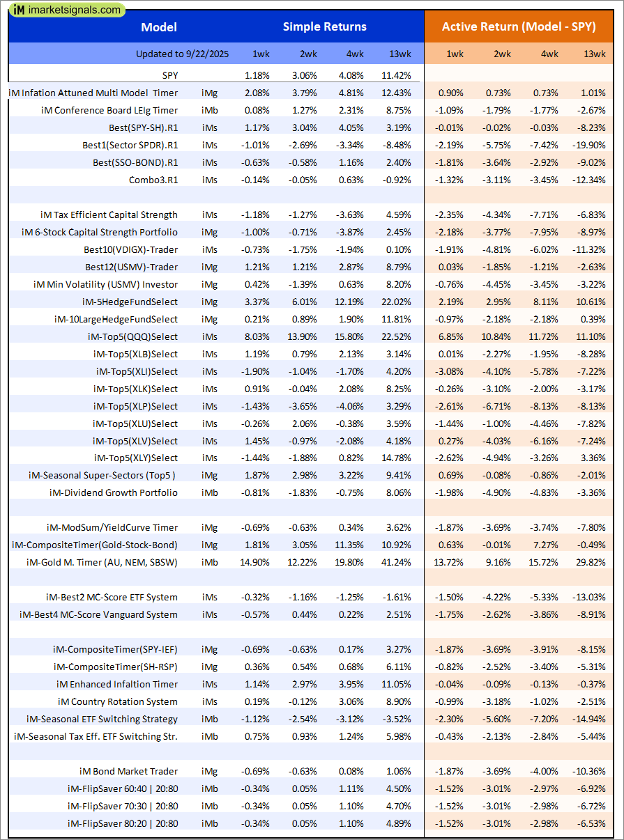 Performance-wk-9-23-2025 Performance-mth-9-23-2025 Out of sample performance summary of our models for the past 1, 2, 4 and 13 week periods. The active active return indicates how the models over- or underperformed the benchmark ETF SPY. Also the YTD, and the 1-, 3-, 5- and 10-year annualized returns are shown in the second table