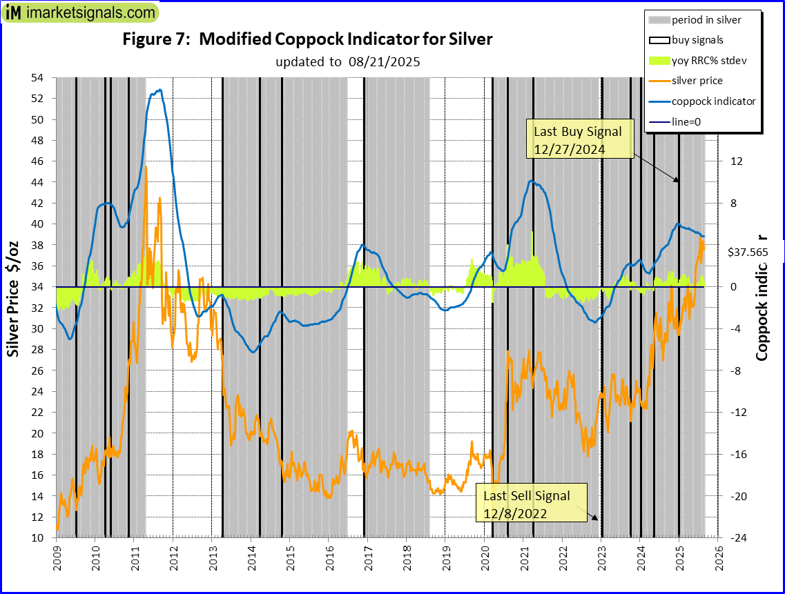 The modified Coppock Gold indicator, shown in Fig 6, generated a buy signal mid July 2025 and is invested in gold.