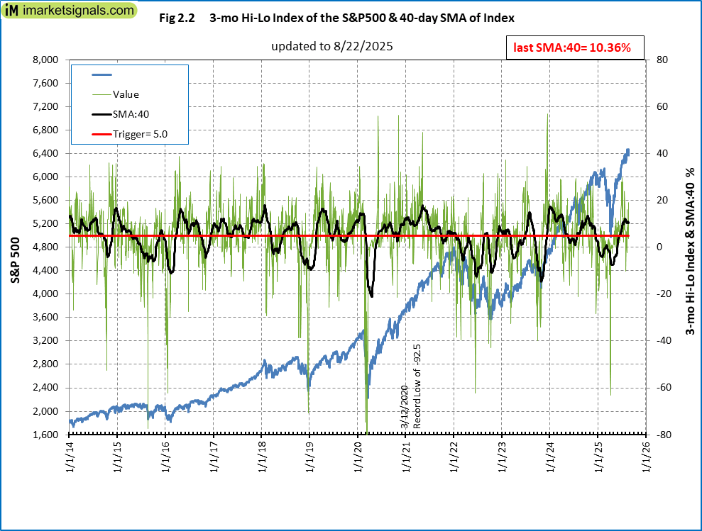 Fig-2.2-8-22-2025The 3-mo Hi-Lo Index Index of the S&P500 is at 10.35%  (last week 10.91%) and  entered the markets mid June,  2025.