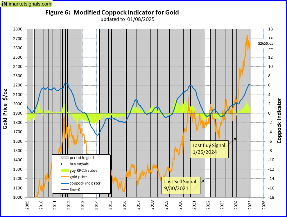 The modified Coppock Gold indicator, shown in Fig 6, generated a buy signal beginning March 2022 and is invested in gold.