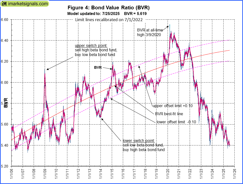 Fig-4.-7-25-2025The BVR-model  favors high beta bonds (long-bonds)  and  intermediate duration bonds when the BVR rises. The Bond Value Ratio as shown in Fig 4  is above last week’s value, and according to the model, only when BVR turns upward after having been lower than the lower offset-line should one consider long bonds again.