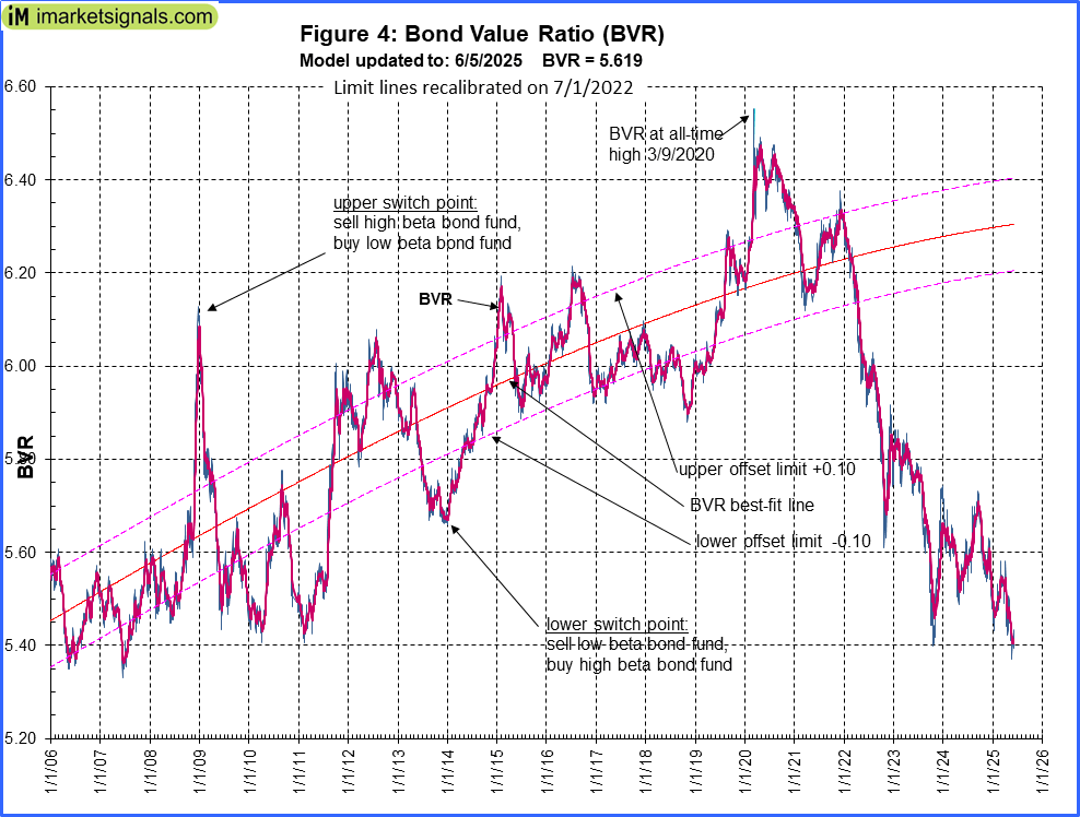 Fig-4.-6-6-2025The BVR-model  favors high beta bonds (long-bonds)  and  intermediate duration bonds when the BVR rises. The Bond Value Ratio as shown in Fig 4  is above last week’s value, and according to the model, only when BVR turns upward after having been lower than the lower offset-line should one consider long bonds again.