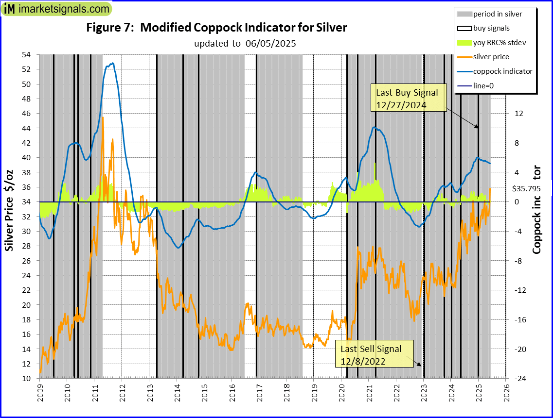 Fig-7.-6-6-2025The modified Coppock Silver indicator shown in Fig 7.  iM-coppock model regenerated a buy signal end mid May 2024 and is invested in Silver.