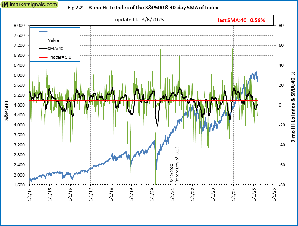 Fig-2.2-3-8-2025The 3-mo Hi-Lo Index Index of the S&P500 is at +0.6%  (last week 0%) and  exited the markets Decemeber 18,  2024.