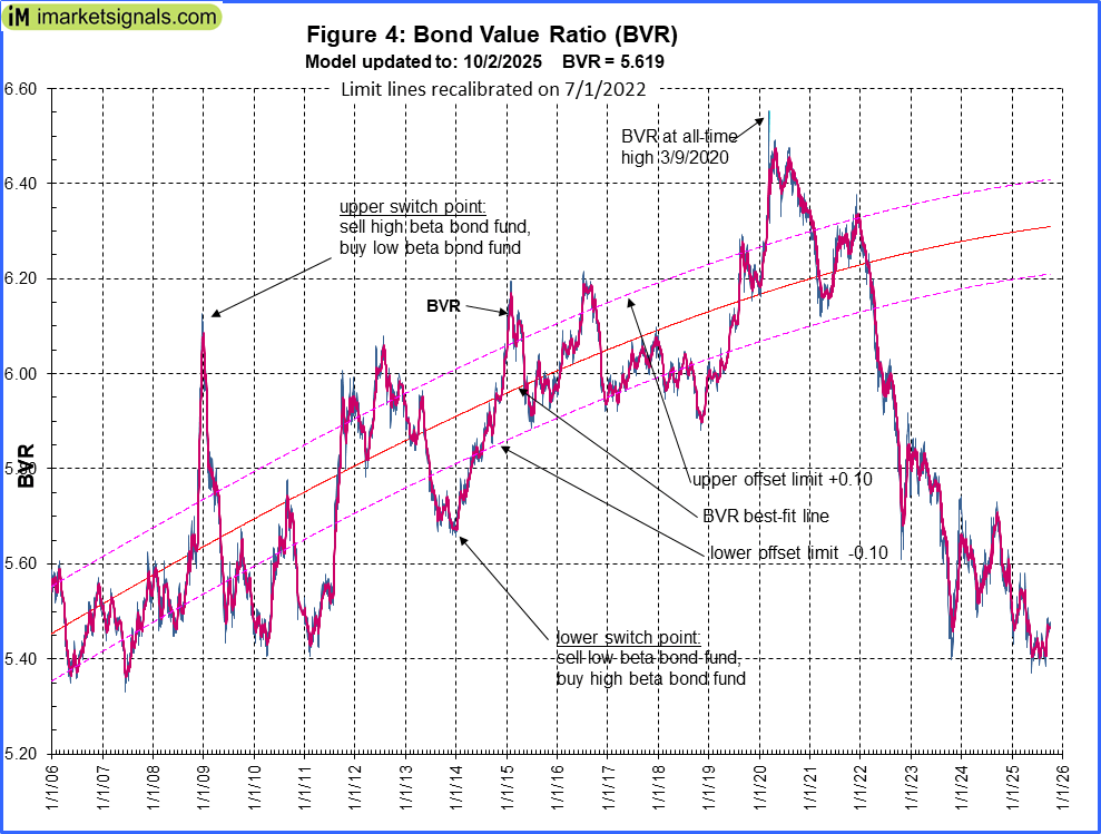 Fig-4.-10-3-2025The BVR-model  favors high beta bonds (long-bonds)  and  intermediate duration bonds when the BVR rises. The Bond Value Ratio as shown in Fig 4  is above last week’s value, and according to the model, only when BVR turns upward after having been lower than the lower offset-line should one consider long bonds again.