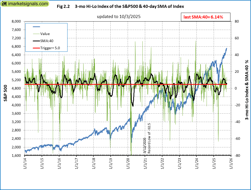 The 3-mo Hi-Lo Index Index of the S&P500 is at 6.14% (last week 4.95%) and is invested in the markets..