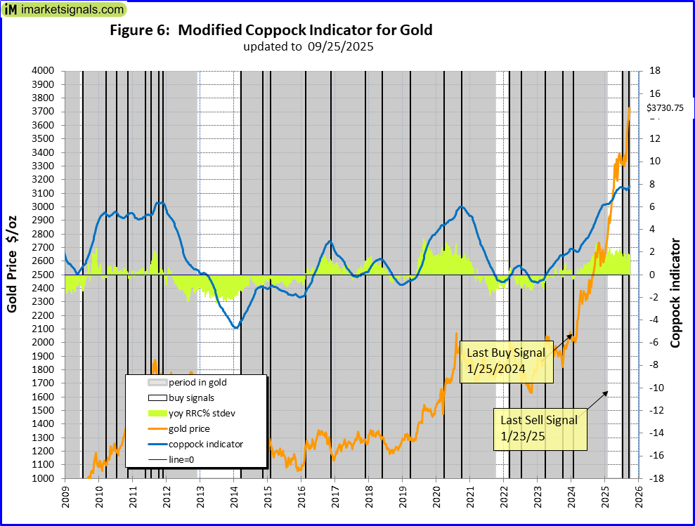 The modified Coppock Gold indicator, shown in Fig 6, generated a buy signal mid July 2025 and is invested in gold.