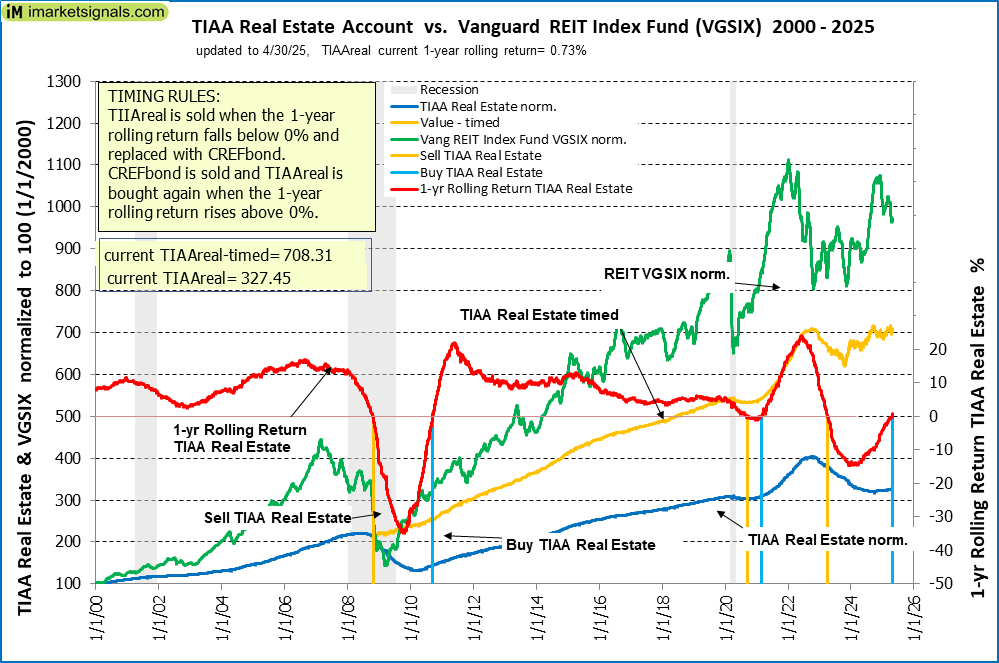 The 1-year rolling return is =0.73% (previous month -2.3%) and is invested in The TIAA Real Estate Account since beginning May 2025.