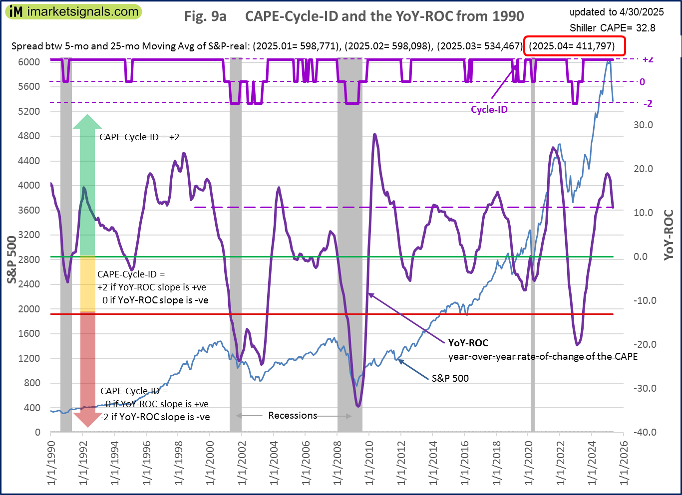 Fig 9a depicts the CAPE-Cycle-ID and the year-on-year rate-of-change of the Shiller CAPE; the level switched from -2 to 0 end of June 2023 generating a buy signal. This indicator now invested in the markets. This indicator is described here.