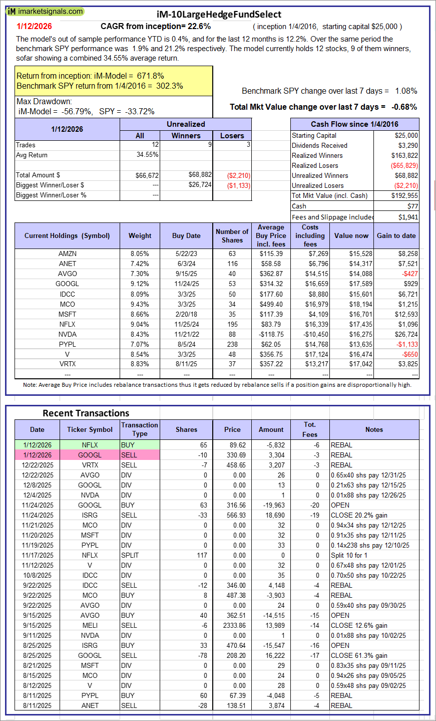 iM-10LargeHedgeFundSelect: Since inception, on 1/5/2016, the model gained 671.82% while the benchmark SPY gained 302.32% over the same period. Over the previous week the market value of iM-10LargeHedgeFundSelect gained -0.68% at a time when SPY gained 1.08%. A starting capital of $25,000 at inception on 1/5/2016 would have grown to $192,955 which includes $77 cash and excludes $1,941 spent on fees and slippage. |
