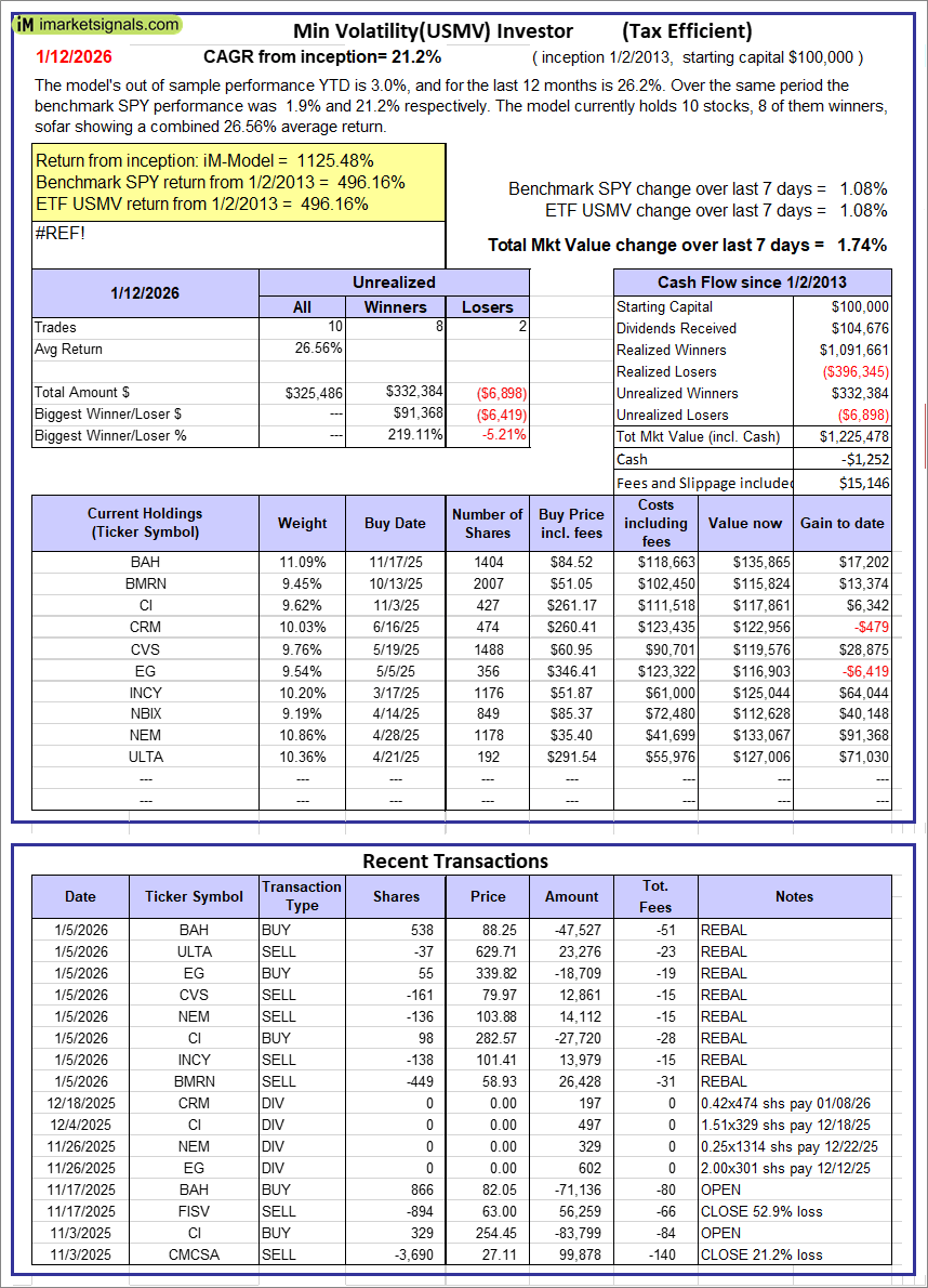 iM-Min Volatility(USMV) Investor (Tax Efficient): The model’s out of sample performance YTD is 3.0%, and for the last 12 months is 26.2%. Over the same period the benchmark SPY performance was 1.9% and 21.2% respectively. Since inception, on 1/3/2013, the model gained 1125.48% while the benchmark SPY gained 496.16% and the ETF USMV gained 496.16% over the same period. Over the previous week the market value of iM-Best12(USMV)Q1 gained 1.74% at a time when SPY gained 1.08%. A starting capital of $100,000 at inception on 1/3/2013 would have grown to $1,225,478 which includes -$1,252 cash and excludes $15,146 spent on fees and slippage. |