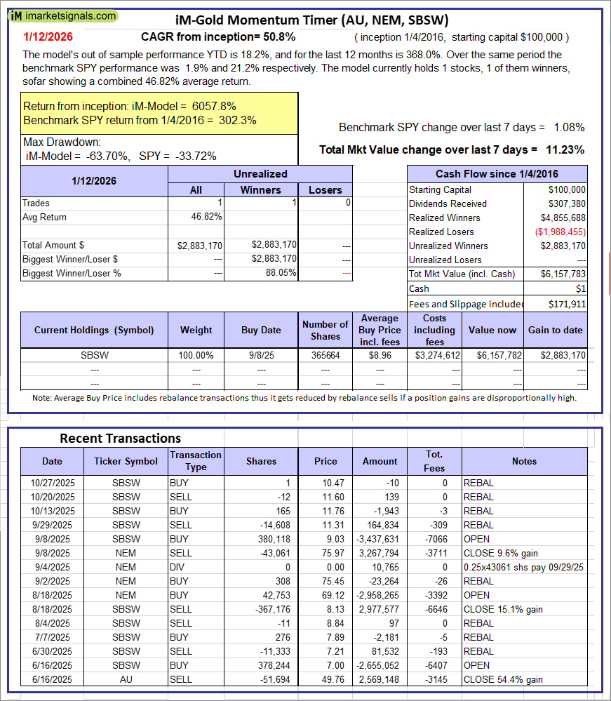 iM-Gold Momentum Timer (AU, NEM, SBSW): The model’s out of sample performance YTD is 18.2%, and for the last 12 months is 368.0%. Over the same period the benchmark SPY performance was 1.9% and 21.2% respectively. Over the previous week the market value of iM-Gold Momentum Timer (AU, NEM, SBSW) gained 11.23% at a time when SPY gained 1.08%. A starting capital of $100,000 at inception on 6/30/2016 would have grown to $01 which includes $171,911 cash and excludes Gain to date spent on fees and slippage. |