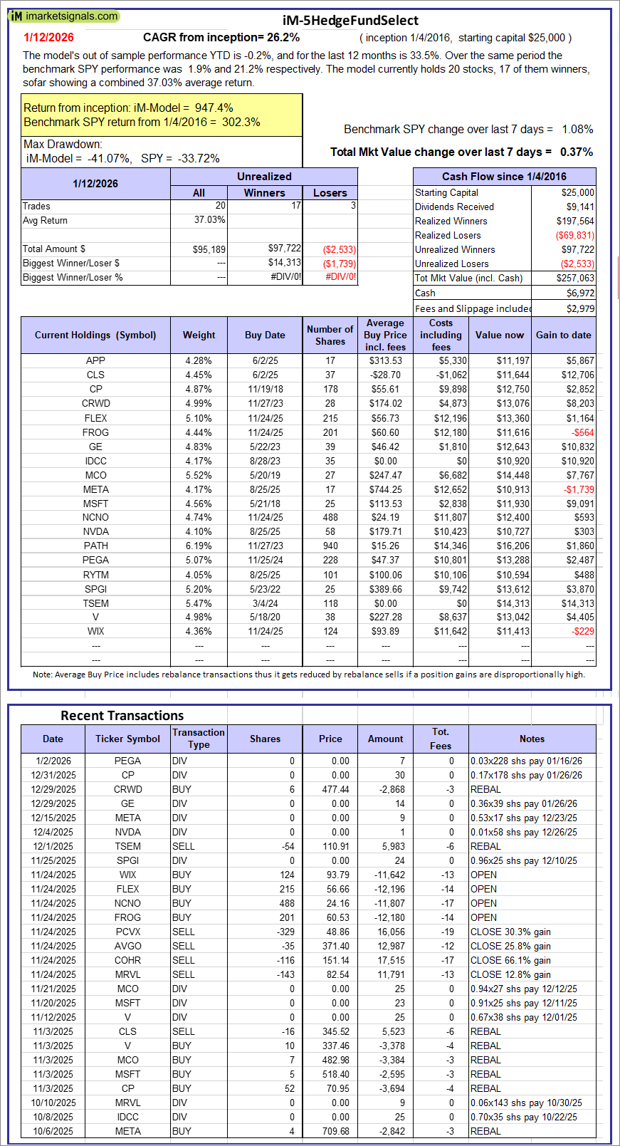 iM-5HedgeFundSelect: Since inception, on 1/5/2016, the model gained 947.44% while the benchmark SPY gained 302.32% over the same period. Over the previous week the market value of iM-5HedgeFundSelect gained 0.37% at a time when SPY gained 1.08%. A starting capital of $25,000 at inception on 1/5/2016 would have grown to $257,063 which includes $6,972 cash and excludes $2,979 spent on fees and slippage. |