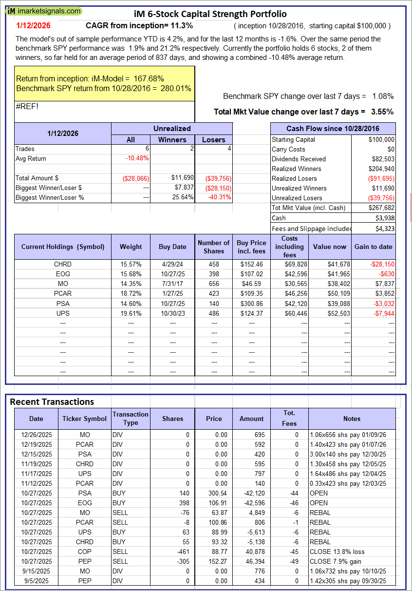 iM 6-Stock Capital Strength Portfolio: The model’s out of sample performance YTD is 4.2%, and for the last 12 months is -1.6%. Over the same period the benchmark SPY performance was 1.9% and 21.2% respectively. Over the previous week the market value of the iM 6-Stock Capital Strength Portfolio gained 3.55% at a time when SPY gained 1.08%. A starting capital of $100,000 at inception on 10/28/2016 would have grown to $267,682 which includes $3,938 cash and excludes $4,323 spent on fees and slippage. |