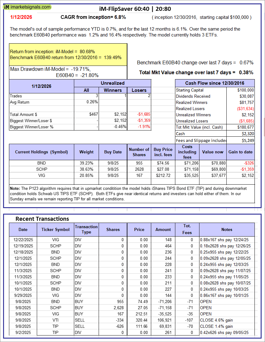 iM-FlipSaver 60:40 | 20:80 – 2017: The model’s out of sample performance YTD is 0.7%, and for the last 12 months is 6.1%. Over the same period the benchmark E60B40 performance was 1.2% and 16.4% respectively. Over the previous week the market value of iM-FlipSaver 80:20 | 20:80 gained 0.38% at a time when SPY gained 0.67%. A starting capital of $100,000 at inception on 7/16/2015 would have grown to $180,677 which includes $2,320 cash and excludes $5,249 spent on fees and slippage. |