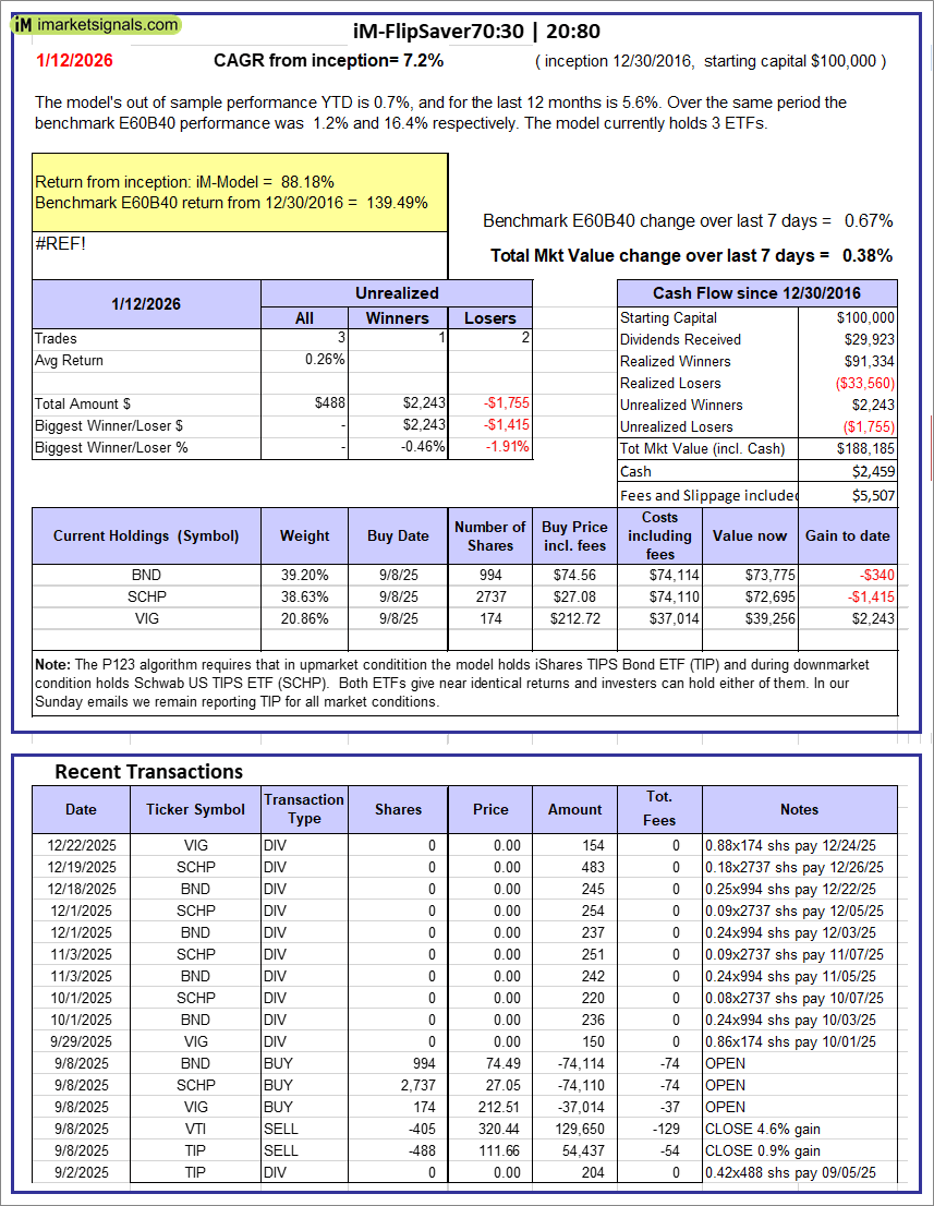 iM-FlipSaver 70:30 | 20:80 – 2017: The model’s out of sample performance YTD is 0.7%, and for the last 12 months is 5.6%. Over the same period the benchmark E60B40 performance was 1.2% and 16.4% respectively. Over the previous week the market value of iM-FlipSaver 70:30 | 20:80 gained 0.38% at a time when SPY gained 0.67%. A starting capital of $100,000 at inception on 7/15/2015 would have grown to $188,185 which includes $2,459 cash and excludes $5,507 spent on fees and slippage. |