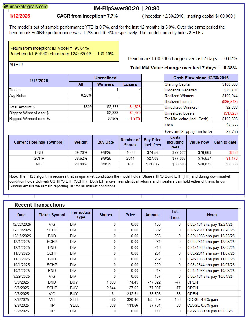 iM-FlipSaver 80:20 | 20:80 – 2017: The model’s out of sample performance YTD is 0.7%, and for the last 12 months is 5.0%. Over the same period the benchmark E60B40 performance was 1.2% and 16.4% respectively. Over the previous week the market value of iM-FlipSaver 80:20 | 20:80 gained 0.38% at a time when SPY gained 0.67%. A starting capital of $100,000 at inception on 1/2/2017 would have grown to $195,606 which includes $2,565 cash and excludes $5,756 spent on fees and slippage. |