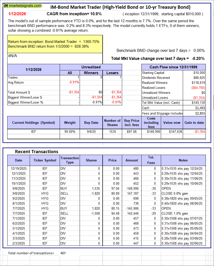 iM-Bond Market Trader (High-Yield Bond or 10-yr Treasury Bond): The model’s out of sample performance YTD is 0.0%, and for the last 12 months is 7.7%. Over the same period the benchmark BND performance was 0.2% and 8.3% respectively. Over the previous week the market value of the iM-Bond Market Trader (High-Yield Bond or 10-yr Treasury Bond) gained -0.20% at a time when BND gained 0.06%. A starting capital of $10,000 at inception on 1/3/2000 would have grown to $149,130 which includes $1,493 cash and excludes $2,855 spent on fees and slippage. |