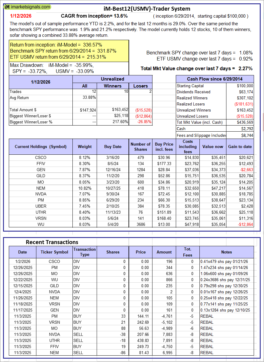 iM-Best12(USMV)-Trader: The model’s out of sample performance YTD is 2.2%, and for the last 12 months is 29.0%. Over the same period the benchmark SPY performance was 1.9% and 21.2% respectively. Since inception, on 6/30/2014, the model gained 336.57% while the benchmark SPY gained 331.87% and the ETF USMV gained 215.31% over the same period. Over the previous week the market value of iM-Best12(USMV)-Trader gained 2.27% at a time when SPY gained 1.08%. A starting capital of $100,000 at inception on 6/30/2014 would have grown to $436,569 which includes $2,792 cash and excludes $8,744 spent on fees and slippage. |