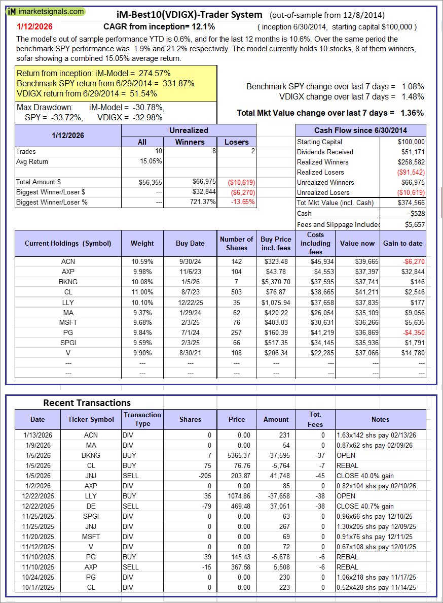 iM-Best10(VDIGX)-Trader: The model’s out of sample performance YTD is 0.6%, and for the last 12 months is 10.6%. Over the same period the benchmark SPY performance was 1.9% and 21.2% respectively. Since inception, on 7/1/2014, the model gained 274.57% while the benchmark SPY gained 331.87% and VDIGX gained 51.54% over the same period. Over the previous week the market value of iM-Best10(VDIGX) gained 1.36% at a time when SPY gained 1.08%. A starting capital of $100,000 at inception on 7/1/2014 would have grown to $374,566 which includes -$528 cash and excludes $5,657 spent on fees and slippage. |