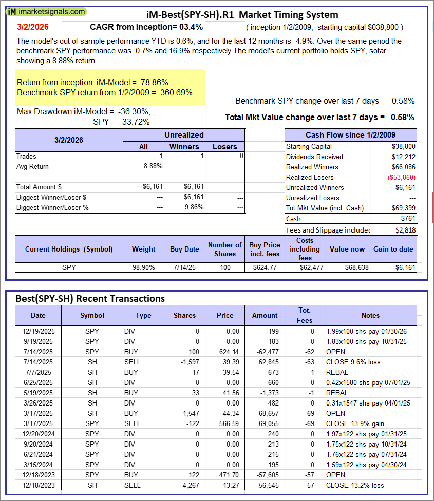 iM-Best(SPY-SH).R1: The model’s out of sample performance YTD is 0.6%, and for the last 12 months is -4.9%. Over the same period the benchmark SPY performance was 0.7% and 16.9% respectively. Over the previous week the market value of Best(SPY-SH) gained 0.58% at a time when SPY gained 0.58%. A starting capital of $100,000 at inception on 1/2/2009 would have grown to $69,399 which includes $761 cash and excludes $2,818 spent on fees and slippage. |