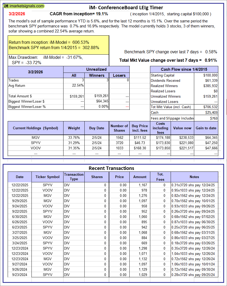 iM-Conference Board LEIg Timer: The model’s performance YTD is 14.3%, and for the last 12 months is 7.3%. Over the same period the benchmark SPY performance was 20.1% and 9.4% respectively. Over the previous week the market value of the iM-Conference Board LEIg Timer gained 0.91% at a time when SPY gained 0.58%. A starting capital of $100,000 at inception on 4/5/2017 would have grown to $706,532 which includes $25,403 cash and excludes $763 spent on fees and slippage. |