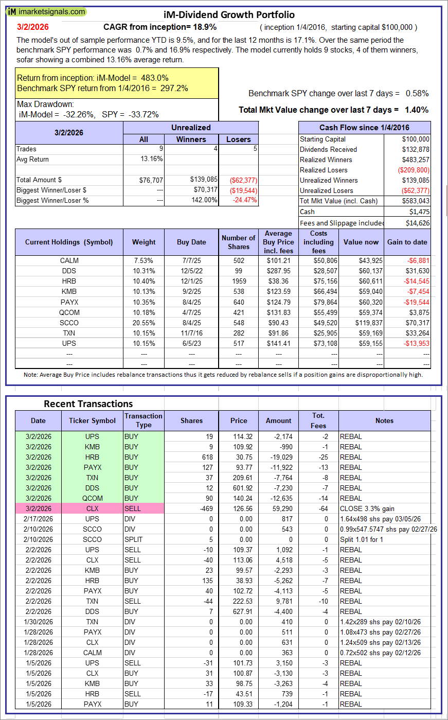 iM-Dividend Growth Portfolio: The model’s out of sample performance YTD is 9.5%, and for the last 12 months is 17.1%. Over the same period the benchmark SPY performance was 0.7% and 16.9% respectively. Over the previous week the market value of the iM-Dividend Growth Portfolio gained 1.40% at a time when SPY gained 0.58%. A starting capital of $100,000 at inception on 6/30/2016 would have grown to $583,043 which includes $1,475 cash and excludes $14,626 spent on fees and slippage. |