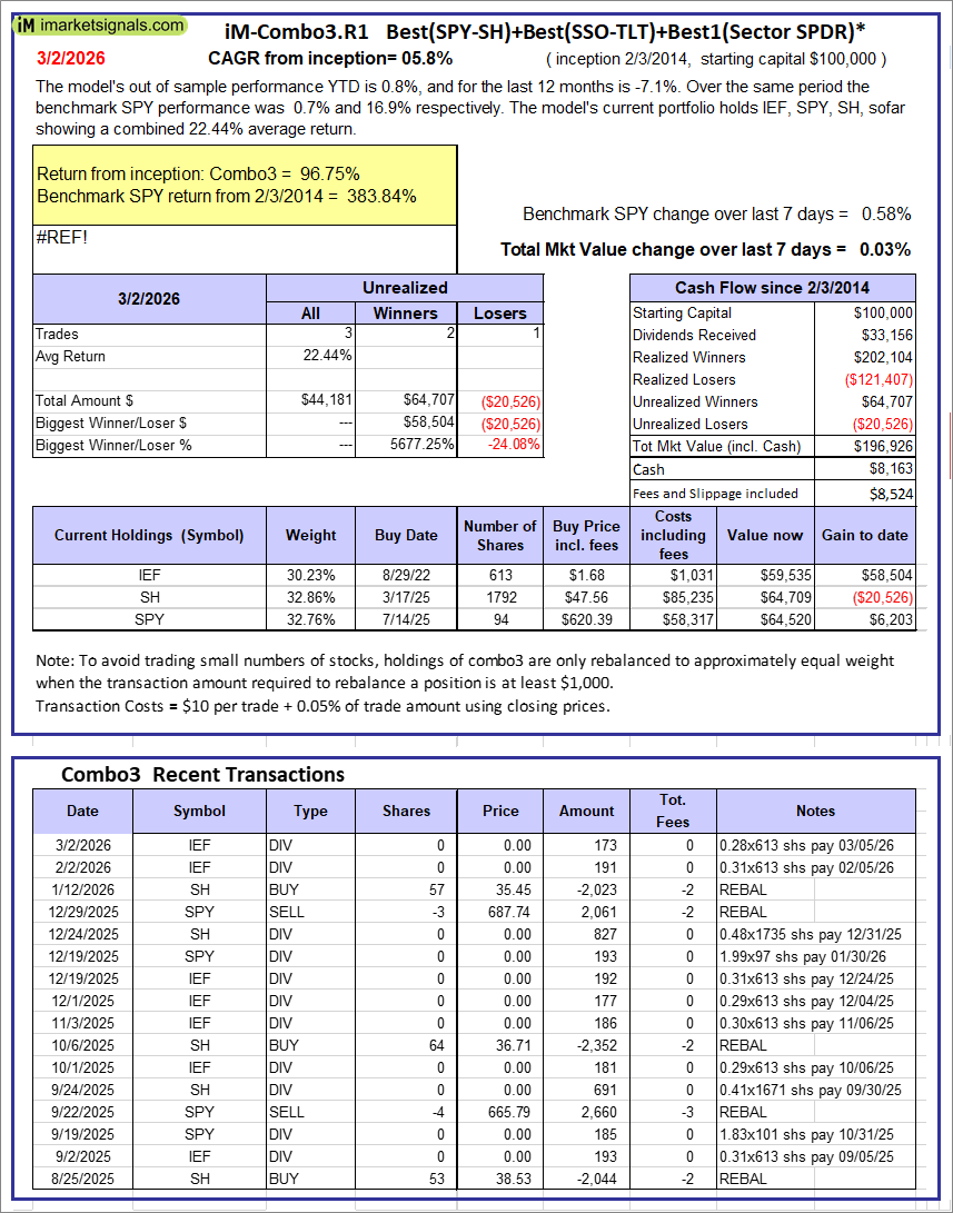 iM-Combo3.R1: The model’s out of sample performance YTD is 0.8%, and for the last 12 months is -7.1%. Over the same period the benchmark SPY performance was 0.7% and 16.9% respectively. Over the previous week the market value of iM-Combo3.R1 gained 0.03% at a time when SPY gained 0.58%. A starting capital of $100,000 at inception on 2/3/2014 would have grown to $196,926 which includes $8,163 cash and excludes $8,524 spent on fees and slippage. |