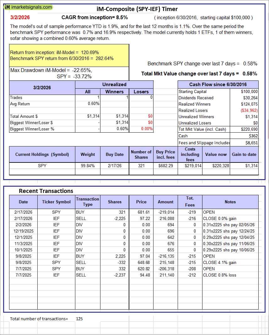 iM-Composite (SPY-IEF) Timer: The model’s out of sample performance YTD is 1.9%, and for the last 12 months is 1.1%. Over the same period the benchmark SPY performance was 0.7% and 16.9% respectively. Over the previous week the market value of the iM-Composite (SPY-IEF) Timer gained 0.58% at a time when SPY gained 0.58%. A starting capital of $100,000 at inception on 6/30/2016 would have grown to $220,690 which includes $362 cash and excludes $8,651 spent on fees and slippage. |