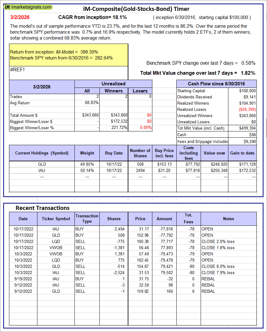 iM-Composite(Gold-Stocks-Bond) Timer: The model’s out of sample performance YTD is 23.7%, and for the last 12 months is 86.2%. Over the same period the benchmark SPY performance was 0.7% and 16.9% respectively. Over the previous week the market value of the iM-Composite(Gold-Stocks-Bond) Timer gained 1.82% at a time when SPY gained 0.58%. A starting capital of $100,000 at inception on 6/30/2016 would have grown to $499,304 which includes $36 cash and excludes $9,190 spent on fees and slippage. |
