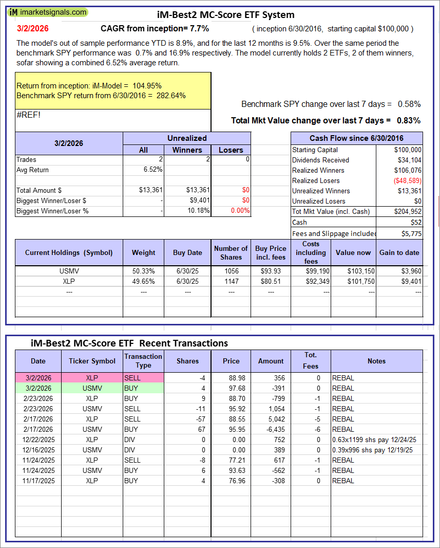 iM-Best2 MC-Score ETF System: The model’s out of sample performance YTD is 8.9%, and for the last 12 months is 9.5%. Over the same period the benchmark SPY performance was 0.7% and 16.9% respectively. Over the previous week the market value of the iM-Best2 MC-Score ETF System gained 0.83% at a time when SPY gained 0.58%. A starting capital of $100,000 at inception on 6/30/2016 would have grown to $204,952 which includes $52 cash and excludes $5,775 spent on fees and slippage. |