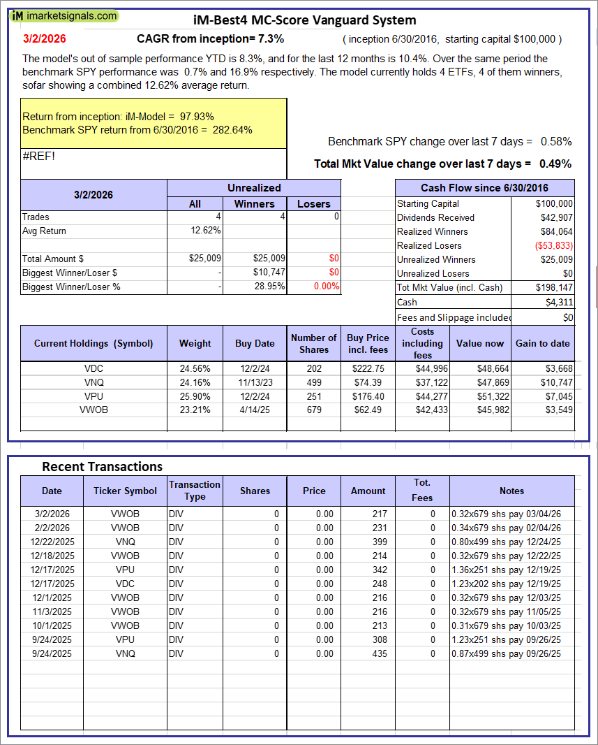 iM-Best4 MC-Score Vanguard System: The model’s out of sample performance YTD is 8.3%, and for the last 12 months is 10.4%. Over the same period the benchmark SPY performance was 0.7% and 16.9% respectively. Over the previous week the market value of the iM-Best4 MC-Score Vanguard System gained 0.49% at a time when SPY gained 0.58%. A starting capital of $100,000 at inception on 6/30/2016 would have grown to $198,147 which includes $4,311 cash and excludes $00 spent on fees and slippage. |