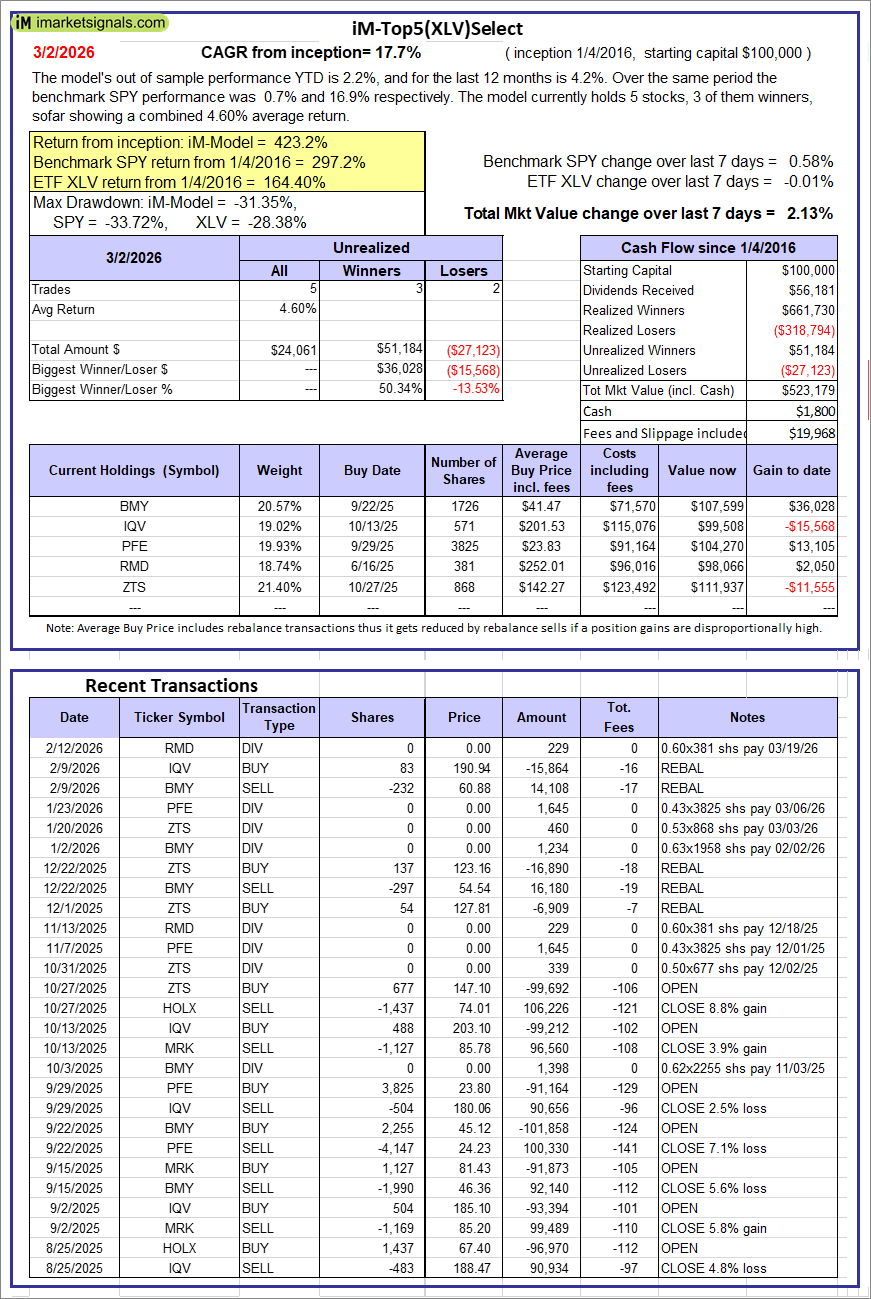 iM-Top5(XLV)Select: Since inception, on 1/5/2016, the model gained 423.18% while the benchmark SPY gained 297.24% over the same period. Over the previous week the market value of iM-Top5(XLV)Select gained 2.13% at a time when SPY gained 0.58%. A starting capital of $100,000 at inception on 1/5/2016 would have grown to $523,179 which includes $1,800 cash and excludes $19,968 spent on fees and slippage. |