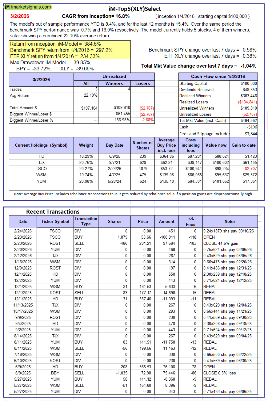 iM-Top5(XLY)Select: Since inception, on 1/5/2016, the model gained 384.56% while the benchmark SPY gained 297.24% over the same period. Over the previous week the market value of iM-Top5(XLY)Select gained -1.04% at a time when SPY gained 0.58%. A starting capital of $100,000 at inception on 1/5/2016 would have grown to $484,562 which includes -$196 cash and excludes $7,844 spent on fees and slippage. |